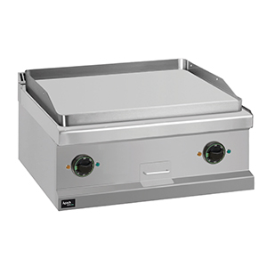 Модель оснащена гладкой жарочной поверхностью из чугуна, размером 650х570 мм и толщиной 15 мм, с двумя независимыми зонами нагрева. Нагрев производится армированными нагревательными элементами из нержавеющей стали.